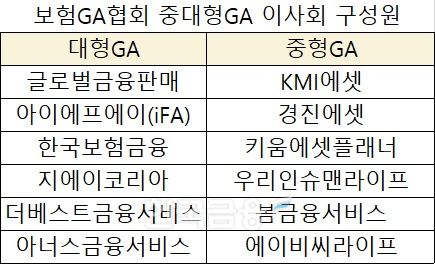 대형GA과 중형GA 이사회 구성원이 1명씩 추가되면서 대형GA에서는 유퍼스트와 KGA에셋 대신 지에이코리아, 더베스트금융서비스가, 중형 GA는 우리인슈맨라이프가 신규 이사회 구성원으로 포함됐다.