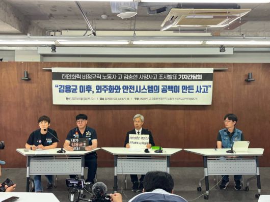 김 씨 동료들과 발전소 비정규직 노조, 김용균 재단 등이 참여하는 '태안화력 김충현 비정규직 노동자 사망사고 대책위원회'는 5일 오후 서울 종로구 참여연대 건물에서 '고 김충현 씨 사망사고에 대한 1차 조사 발표 기자간담회'를 열고 이같이 밝혔다.