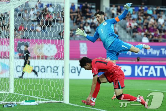 이후에도 한국은 왼쪽 측면 윤재석을 활용해 공격을 이어갔지만 슈팅의 정확도가 떨어져 단 1개의 유효슈팅도 시도하지 못하고 전반을 마쳤다.