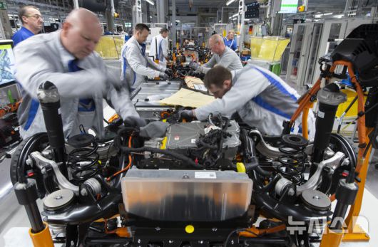 [츠비카우=AP/뉴시스] 독일 츠비카우에 있는 폴크스바겐 공장에서 전기차를 조립하고 있다. 자료사진. 2025.05.08 |