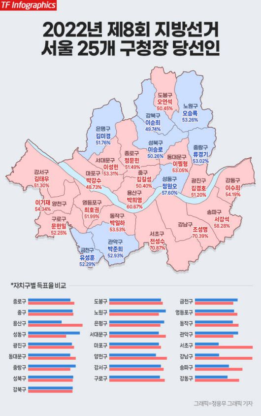 이번 결과는 불과 3년 전인 2022년 지방선거와는 대조적이다. 당시 서울 25개 자치구 중 국민의힘은 18곳에서 구청장을 배출하며 압도적인 승리를 거뒀고, 민주당은 7곳에 그쳤다. 특히 한강벨트로 꼽혔던 광진구, 마포구, 동작구, 영등포구 등에서 민주당은 모두 고배를 마셨다.