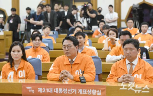 개혁신당 천하람 상임선대위원장이 3일 서울 여의도 국회 의원회관에 마련된 제21대 대통령선거 개표상황실에서 출구조사 결과를 확인한 뒤 아쉬워하고 있다. 방송3사 출구조사는 이재명 51.7%, 김문수 39.3%, 이준석 7.7%로 예측됐다. 박종민 기자