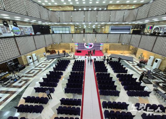 3일 국회 로텐더홀에서 관계자들이 제21대 대통령 취임식을 준비하고 있다. 황진환 기자