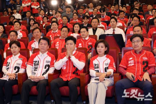 김용태 국민의힘 비상대책위원장과 권성동 원내대표를 비롯한 공동선거대책위원장들이 3일 오후 서울 여의도 국회 도서관에 마련된 제21대 대통령선거개표상황실에서 개표 방송을 시청하고 있다. 방송3사 출구조사는 이재명 51.7%, 김문수 39.3%, 이준석 7.7%로 예측됐다. 황진환 기자