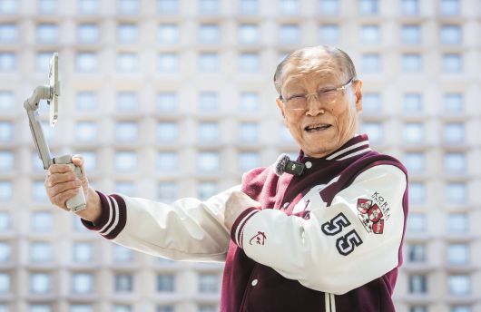 지난달 유튜브 채널을 개설한 이용만 전 재무부장관이 5일 오후 서울 중구 서울광장에서 모교 고려대 야구 점퍼를 입고 포즈를 취하고 있다. 왼쪽 팔에 ‘55학번’이란 문구가 적혀 있다. 사진 촬영이 이어지자 그는 “영정 사진이라도 찍으려는 거냐”라며 웃었다./김지호 기자 |