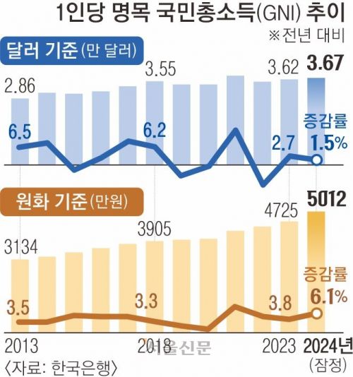 한국은행이 5일 발표한 ‘2024년 국민계정(잠정)’에 따르면 지난해 우리나라의 1인당 GNI는 전년(3만 6195달러)보다 1.5% 증가한 3만 6745달러로 나타났다. 대만(3만 5241달러), 일본(3만 4533달러)을 모두 앞선 수치다. 원달러 환율이 오르면서 원화 기준으로는 전년 대비 6.1% 증가한 5012만원을 기록했다.