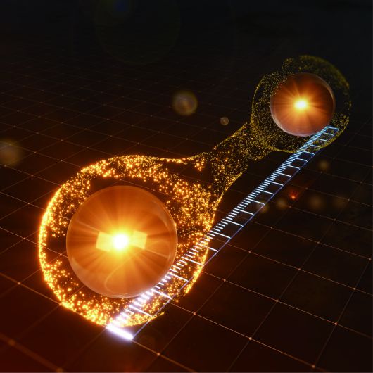 양자거리 측정 개념도. 두 개의 노란 공은 전자를 나타내며, 그 아래 흰색 눈금은 거리를 측정한다는 의미로 ‘자’를 표현한 것이다. 전자 간의 유사성을 의미하는 양자 거리는 실제 거리와 약간 다른 개념이지만 ‘양자거리 측정’을 직관적으로 표현하기 위한 그림이다.[연세대학교 제공] |
