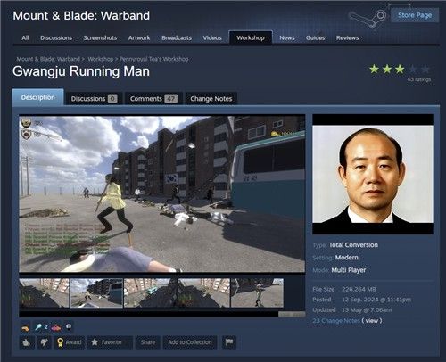 한편 문제의 '광주 런닝맨'은 독립적인 게임이 아닌, '마운트 앤 블레이드: 워밴드'라는 2008년 작 게임의 모드(mod·게임 내용을 수정하는 개조 파일)다. 제작자는 중국인으로 추정된다. 2017년경부터 활동한 것으로 추정되는 모드 업로더의 스팀 프로필을 살펴보면, 중국어 간체자로 쓰인 게임 리뷰를 다수 올린 것이 확인된다.