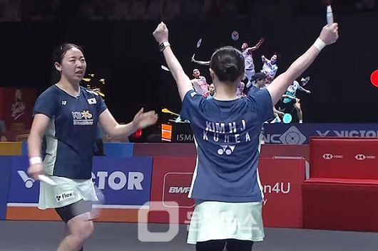 사진 2025 인도네시아오픈 월드투어 슈퍼1000 여자복식 8강 진출을 확정한 김혜정-공희용 조가 기뻐하고 있다. |