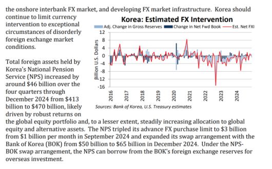 이번 보고서에서 주목할 점은 미 재무부가 국민연금에 대한 언급을 대폭 늘렸다는 점이다. 직전 보고(2024년 11월)서에선 국민연금에 대해 단일 문장 정도만 언급했지만, 이번 보고서에선 한 문단 전체를 할애하며 이전보다 구체적인 내용을 담았다.