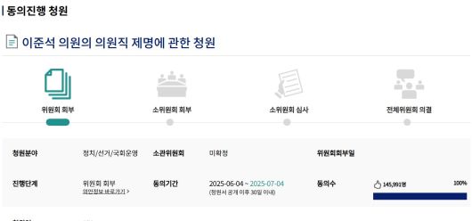 공개 이후 30일 이내에 5만 명 이상 동의를 얻으면 청원이 성립되는데, 이미 요건이 충족된 겁니다. 다만 심사를 맡을 소관위원회는 확정되지 않았습니다.
