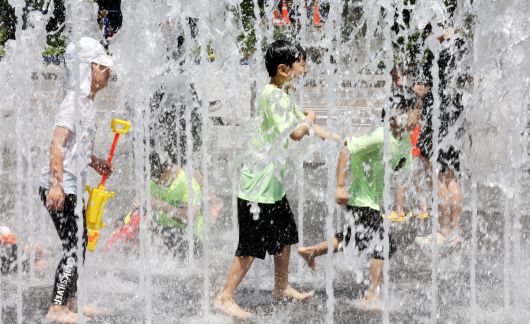 서울 낮 최고기온이 28도까지 올라 무더운 날씨를 보인 6일 서울 종로구 광화문광장 분수대에서 어린이들이 분수에 뛰어들어 물놀이를 하며 더위를 식히고 있다.