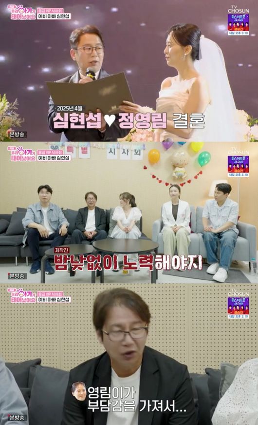 6일 방송된 TV조선 ‘우리 아기가 태어났어요(연출 이승훈 김준/작가 장주연)’에서는 응급 VIP 시사회가 진행됐다. 편집실에서 모인 가운데, 배우 장서희와 ‘55세 새신랑’ 심현섭이 스페셜 게스트로 찾아왔다.