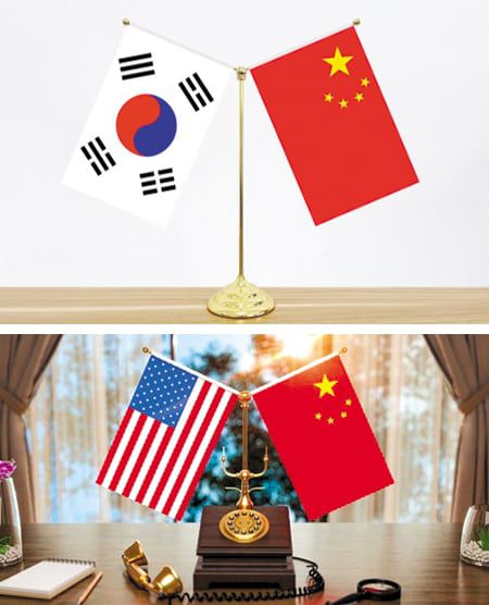 이런 구도는 우리나라 국기법과도 부합한다. 우리 국기법은 외국 국기와 교차 게양할 때 태극기 위치를 왼쪽으로 규정했다(대한민국 국기법 시행령 16조). “국기와 외국기를 교차 게양하는 경우에는 앞에서 봤을 때 국기 깃면이 왼쪽에 오도록 하고, 그 깃대는 외국기의 깃대 앞쪽에 오도록 한다”는 내용이다. 또 태극기를 깃대에 걸 때는 세 줄로 돼있는 건(乾)괘가 왼쪽 상단에 위치해야 한다고 규정한다. 국기법에 첨부된 교차 게양 예시도를 보면 차이나데일리 그림과 흡사하다. 태극기가 뒤집혀 보이는 것은 실제로는 규정에 맞춰서 게양했지만 교차 게양할 때 깃대가 왼쪽으로 기울어지면서 국기가 아래로 늘어뜨려져 뒷면이 보이기 때문이다.