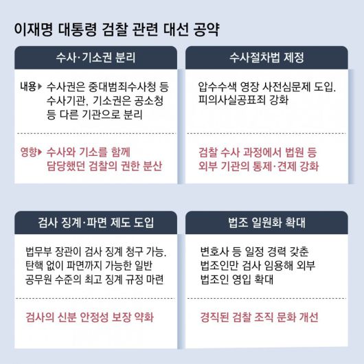 검찰 안팎에선 이 대통령의 공약 대부분이 검찰 권한을 약화시키는 데 초점이 맞춰져 있는 만큼 검찰 조직에 대대적인 개편이 있을 것이라는 전망이 지배적이다. 이 대통령은 압수수색 단계에서부터 법관이 사건 관계자를 심문할 수 있도록 하는 압수수색 영장 사전심문제 도입을 추진하겠다는 방침을 내놓았다. 여기에 그동안 사실상 유명무실했던 피의사실공표죄를 되살려 강화하고, 수사기관의 증거 조작을 강력히 처벌하며 공소시효를 연장하는 방안도 주요 공약에 포함돼 있다.