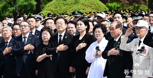 현충일 추념식 참석한 李 “국가유공자에 존경의 마음” 이재명 대통령(앞줄 오른쪽에서 다섯 번째)이 6일 서울 동작구 국립서울현충원에서 열린 제70회 현충일 추념식에서 국민의례를 하고 있다. 이 대통령은 “국민과 나라를 위해 헌신하신 모든 국가유공자들에게 존경과 감사의 마음을, 소중한 가족을 잃으신 유가족분들께는 깊은 위로의 말씀을 드린다”며 “국가를 위한 희생에 합당한 보상이 이루어지게 할 것”이라고 밝혔다. 송은석 기자 silverstone@donga.com |