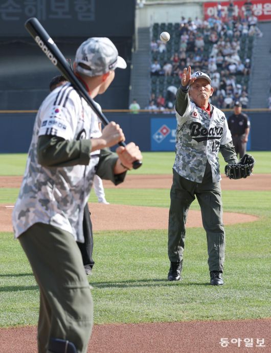 현충일인 6일 오후 서울 잠실야구장에서 열린 프로야구 롯데-두산 경기에서 6·25 참전 공군 조종사인 김두만 장군(오른쪽)이 시구하고 있다. 시타는 김 장군의 전우였던 고 강호륜 장군의 손자인 현직 F-15K 조종사 강병준 소령. 변영욱 기자 cut@donga.com Copyright Ⓒ 동아일보. All rights reserved. 무단 전재, 재배포 및 AI학습 이용 금지