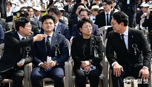 더불어민주당 박찬대 당 대표 권한대행 겸 원내대표, 국민의힘 김용태 비상대책위원장, 조국혁신당 김선민 당 대표 권한대행, 개혁신당 천하람 원내대표 겸 당 대표 권한대행(왼쪽부터)이 6일 서울 동작구 국립서울현충원에서 열린 현충일 추념식에 참석해 행사 시작 전 대화를 나누고 있다. 송은석 기자 silverstone@donga.com |