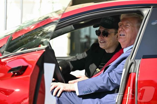 도널드 트럼프 미국 대통령이 지난 3월 11일 (현지시간) 워싱턴 백악관에서 일론 머스크 테슬라 CEO와 빨간색 테슬라 모델 S 세단에 시승을 하고 있다. 2025.03.12 ⓒ AFP=뉴스1 ⓒ News1 우동명 기자 |