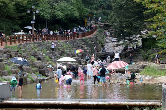 경기 과천시 관악산계곡을 찾은 시민들이 물놀이를 하며 더위를 식히고 있다. 신태현 기자 holjjak@ |