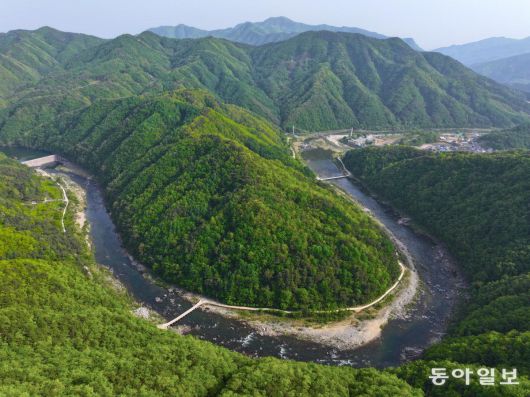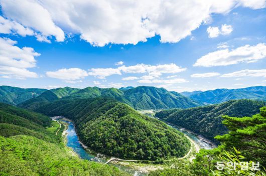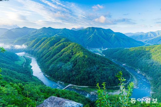 경북 봉화 35번 국도는 청량산을 끼고 굽이굽이 흐르는 낙동강을 따라 이어진다. ‘산(山)태극 수(水)태극’. 산과 물이 서로 어우러지며 음양의 조화를 이루는 곳이다. 봉화군 명호면 범바위전망대에 서면 낙동강이 굽이쳐 물도리를 이루는 모습이 파노라마처럼 펼쳐진다.