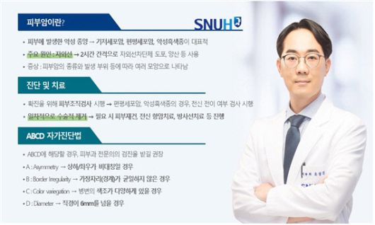 조성진 교수는 또 “대부분의 피부암은 조기에 발견하면 완치할 수 있다. 초기 악성흑색종을 발견하기 위한 자가진단법으로 ABCD방법이 널리 알려져 있으며, 이를 다른 피부암에도 적용해 의심증상이 있으면 반드시 피부과 전문의의 검진을 받아야 한다”고 덧붙였다.