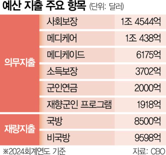 미국 연방정부 지출은 크게 세 부분으로 나뉩니다. △의무지출 △재량지출 △순이자 등입니다. 이 중 의무지출은 매년 자동 집행되는 예산을 말합니다. 미국에서 예산지출에 대한 권한은 의회가 갖는데 의무지출은 매해 의회 승인을 받지 않아도 된다는 의미입니다. 사회보장제도, 저소득 고령자에 대한 건강·의료 지원사업인 메디케어(Medicare), 메디케이드(Medicaid) 등이 대표적으로 의무지출에 해당하는 것들입니다. 2024회계연도 의무지출에 쓰인 금액은 4조 596억 달러에 달합니다. 전체 지출 중 약 60%의 비중을 차지합니다.