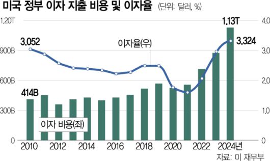 고착화 된 적자구조 탓에 빚 부담은 불어나게 됩니다. 미 재무부에 따르면 미국의 총 정부부채는 2024회계연도 기준 35조 4600억 달러에 이릅니다. 한국 원화로 따지면 약 4경 9000조 원에 달합니다. 빚의 규모도 우려되지만 많은 이들은 빚이 불어나는 속도가 더 공포스럽다고 지적합니다. 2014회계연도 미국의 정부부채는 23조 6300억 달러였던 점을 감안하면 10년 만에 빚 부담은 약 50%가 불었습니다. 그리고 올해 들어 정부부채는 이미 36조 달러를 넘어섰고요. 인구고령화 등으로 앞으로 빚의 증가 속도는 더 빨라질 것으로 예상됩니다.