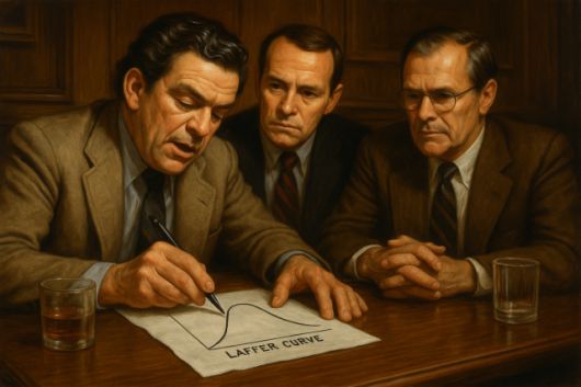 정책의 이론적 기반을 제공한 인물이 바로 경제학자 아서 래퍼입니다. 그는 세율이 적정수준을 넘어 갈 경우 세율을 낮추는 것이 오히려 세수를 늘릴 수 있다고 주장했습니다. 많은 이들에게 래퍼곡선(Laffer curve)이라는 이름으로 알려져 있습니다. 유명한 일화도 있습니다. 1974년 래퍼는 워싱턴 D.C. 한 식당에서 백악관 관계자들과 만나 ‘래퍼곡선’를 냅킨에 그리며 설명한 것으로 알려지는데요. 당시 이 자리에 있던 중 한 명이 2001~2009년 부통령으로 올라서게 됩니다. 미국 역사상 가장 영향력 있는 부통령으로 불리는 딕 체니가 그 주인공입니다. 그와 함께 있었던 또 다른 인물은 미 국방장관 등을 역임한 도널드 럼즈펠드입니다.