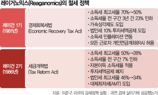 레이건 행정부는 스태그플레이션(경기침체 속 물가상승)이라는 큰 경제위기에서 출범한 정권입니다. 1970년대 두 차례의 ‘오일쇼크’와 베트남전쟁, 브레튼우즈 체제 붕괴 등을 거친 당시 미국에서는 물가는 급등하고 성장은 주춤했으며 실업률은 치솟는 상황이 이어졌습니다. ‘인플레이션 파이터’ 폴 볼커가 주도한 연방준비제도(Fed·연준)은 연방금리를 20%까지 끌어올렸습니다. 이런 상황에서 레이건 정부는 ‘작은 정부’를 들고 나옵니다. 정부 지출을 늘려 수요에 자극을 주는 방식보다 세금 감면과 규제 완화를 통해 민간의 생산과 투자를 늘리는 것이 더 효과적이라고 판단한 것입니다. 이에 따라 소득세 최고세율은 70%에서 28%로 내려갔고 법인세율도 30%대로 낮췄습니다. 당시만 하더라도 전례를 찾기 힘든 수준의 감세 정책으로 평가됩니다.