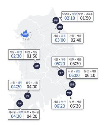 같은 시각 지방 도시에서 서울까지는 △부산 6시간 30분 △울산 6시간 10분 △강릉 2시간 40분 △양양 1시간 50분(남양주 도착) △대전 1시간 50분 △광주 4시간 △목포 4시간 20분(서서울 도착) △대구 5시간 30분이다.