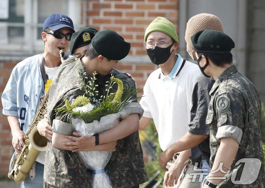 그룹 방탄소년단(BTS) RM, 지민, 제이홉, 뷔, 정국이 12일 오전 경기도 연천 소재 육군 제5보병사단 신병교육대대에서 육군 현역으로 군 복무를 마친 진(왼쪽)을 축하하고 있다. 2024.6.12/뉴스1 ⓒ News1 권현진 기자 |