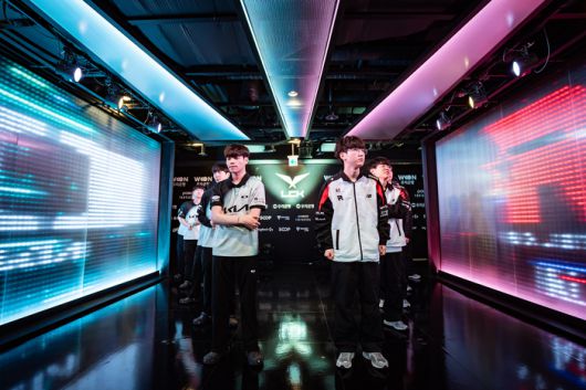 디플러스 기아와 KT 롤스터 선수단이 4일 서울 종로구 롤 파크에서 열린 2025 LCK 정규시즌 5·6위 결정전에 앞서 입장을 준비하고 있다. 사진 | 라이엇 게임즈 |