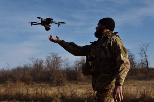우크라이나 군인이 소형 드론을 날리고 있다. 러시아-우크라이나 전쟁은 연간 수백만 대 드론이 싸우는 드론 전쟁이 되었다. AP 뉴시스 |