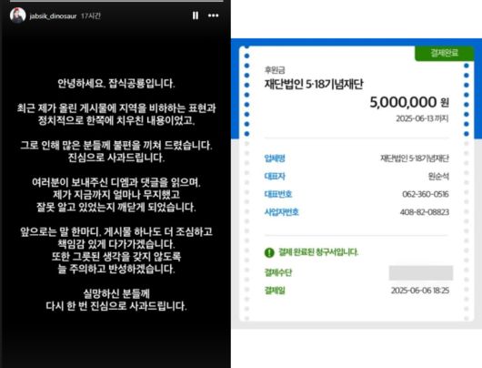 잡식공룡은 해당 사과문과 함께 5·18 기념재단에 500만원을 기부한 결제 이력을 공개하며, "기부한다고 해서 제 잘못이 없어지는 것이 아니라는 것 또한 분명히 명심하고 있겠다"고 거듭 사과했다.