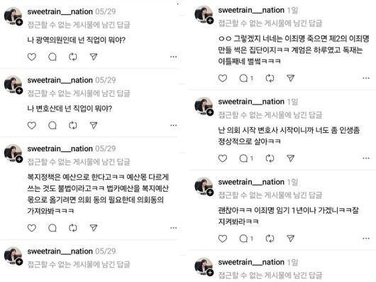 에스엔에스(SNS)에서 시민과 거친 설전을 벌여 논란을 빚은 현역 시의원이 다른 시민에게도 “해충”, “환자” 등 거친 표현을 썼던 것으로 확인됐다. 해당 시의원은 이재명 대통령과 문재인 전 대통령에 대해서도 “이죄명”, “문재앙” 등 막말을 서슴지 않았다.