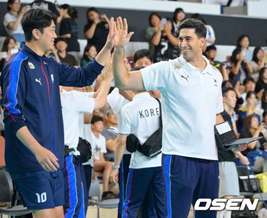 경기를 마치고 대한민국 이사니예 라미레스 감독이 나경복과 하이파이브를 하고 있다. 2025.06.07 /rumi@osen.co.kr