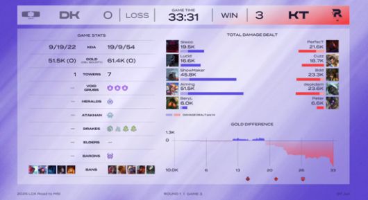 DK가 탑에서 3인 갱킹으로 반전을 노렸지만, KT는 미드에서 '쇼메이커'를 끊어낸 뒤 탑, 미드 1차 포탑을 연달아 밀어내며 운영과 교전 양면에서 우위를 점했다. 미드 한타에서도 '덕담'의 궁극기와 '비디디'의 매혹이 결정적으로 작용해 교전 승리를 거뒀고, 이어진 한타에서 에이스를 만들며 그대로 넥서스를 밀어 2세트까지 가져갔다.