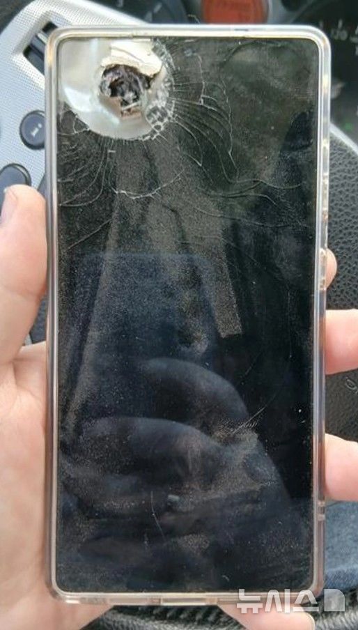 [서울=뉴시스]파편을 막아낸 삼성전자 스마트폰 갤럭시 S25 울트라 (사진 = 메자 캡처) |