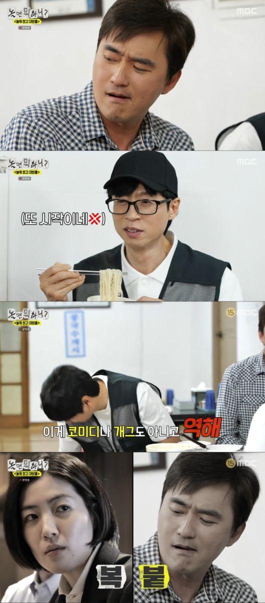 특히 이이경은 최근 화제가 되고 있는 ‘어글리 면치기’를 선보여 이목을 끌었다. 특히 바로 옆에서 이를 직관한 김석훈은 질색하는 얼굴로 이를 바라봐 웃음을 안겼다.