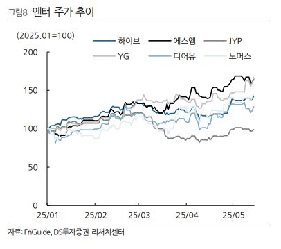 이에 더해 최근 한한령 해제 가능성이 거론되며 엔터사가 증익 사이클에 접어들 수 있다는 전망이 고개를 들고 있다. 이재명 대통령이 후보 시절 문화산업 육성 의지를 밝히면서 실용주의 외교 노선을 강조해왔다. 이런 새 정부 기조에 따라 한중관계가 개선될 가능성이 거론되며 엔터주가 그 수혜를 입을 수 있다는 전망이 힘을 얻고 있다.