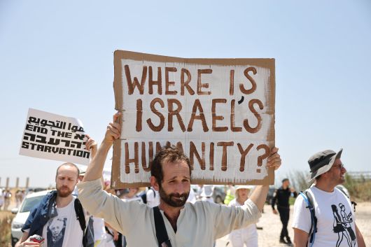 6일 이스라엘 활동가들이 종전을 촉구하며 벌인 사위에서 참가자들이 "이스라엘의 인간성은 어디 있나" "기근을 멈춰라" 등 문구를 적은 피켓을 들고 있다. /EPA 연합뉴스 |