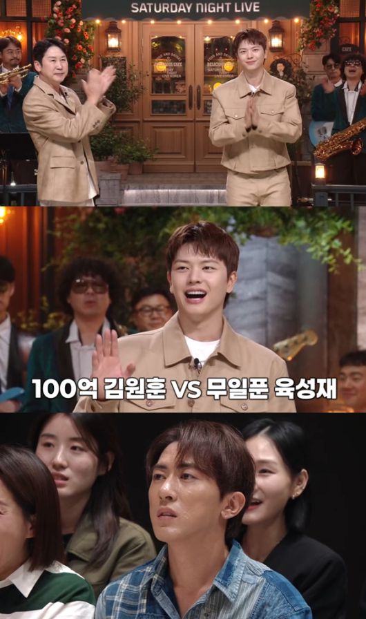 이에 신동엽은 "그럼 '1000억 김원훈 VS 무일푼 육성재' 중에서는 누구냐?"라고 물었고, 육성재는 "정말 아무것도 없이 새롭게 시작해도 즐거울 것 같다"고 말했다. 이에 김원훈은 레이저 눈빛을 쏴 폭소를 안겼다.