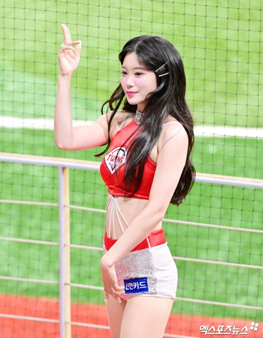 (엑스포츠뉴스 고척, 김한준 기자) 7일 오후 서울 구로구 고척스카이돔에서 열린 '2025 신한 SOL Bank KBO리그' LG 트윈스와 키움 히어로즈의 경기, 계유진 치어리더가 멋진 공연을 선보이고 있다.김한준 기자 kowel@xportsnews.com