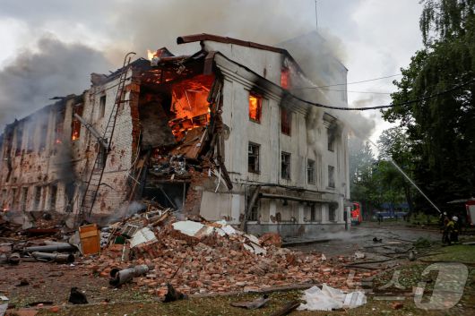 우크라이나 하르키우에서 소방관들이 러시아 드론 공격을 받은 건물의 화재를 진압하고 있다. 2025.6.7 ⓒ 로이터=뉴스1 ⓒ News1 강민경 기자 |
