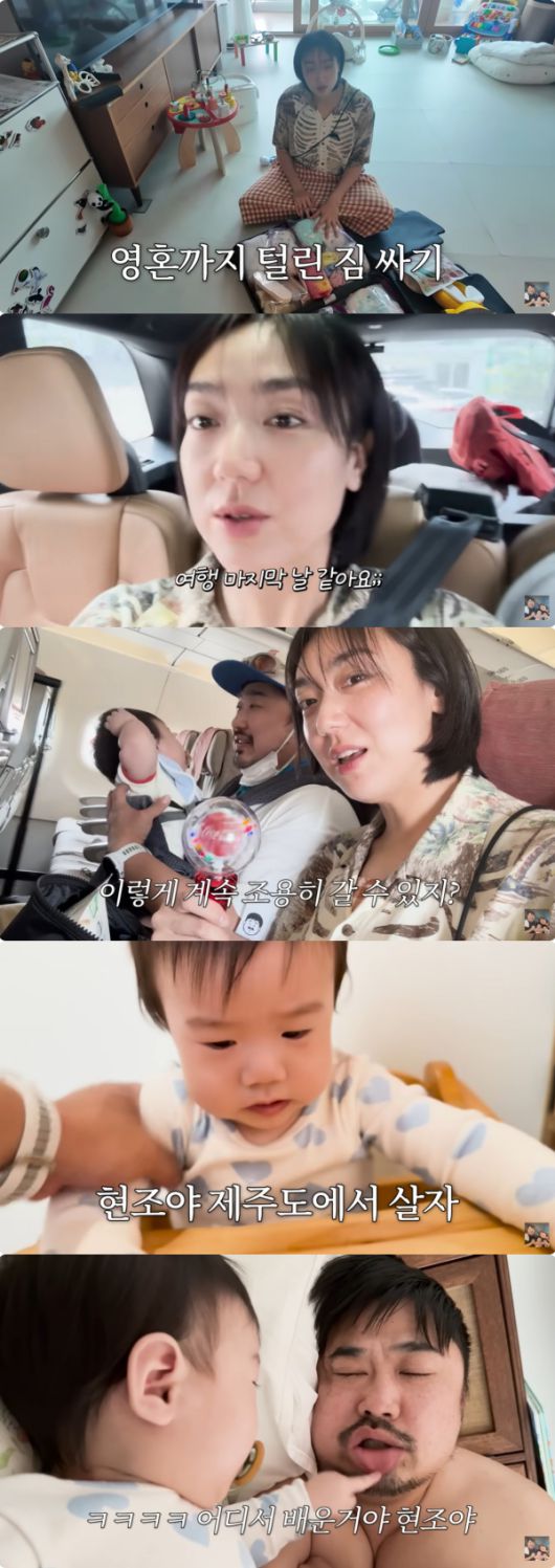 이날 강재준·이은형 부부는 아들 현조와 함께 제주도로 1박 2일 여행을 떠났다. 당일 아침까지 짐을 싸는 이은형은 "죽는 줄 알았다. 혼이 다 빠졌다"며 "이틀 가는데 기저귀 12개, 휴대용 보리차, 분유 밀키트, 수건, 가디건, 일회용 턱받이를 챙겼다. 현타 온다"고 털어놨다.