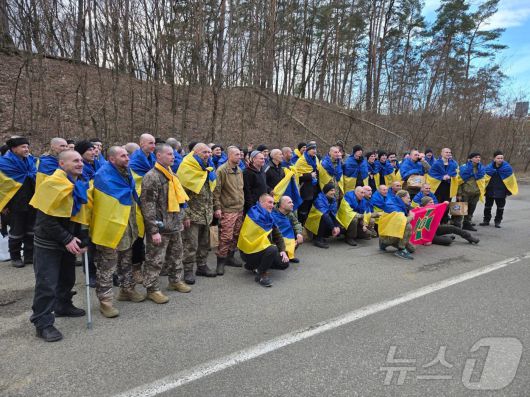 19일(현지시간) 러시아에 억류 중 UAE로 중재로 석방된 우크라이나 전쟁 포로 175명이 국기를 두른 채 이동을 기다리고 있다. 2025.03.20 ⓒ AFP=뉴스1 ⓒ News1 우동명 기자 |