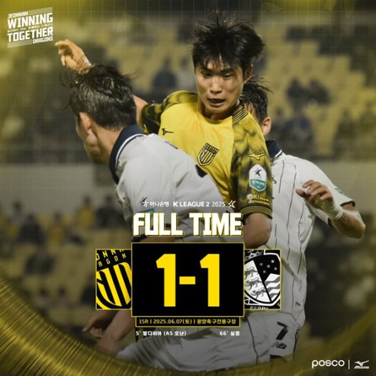 전남은 7일 토요일 광양축구전용구장에서 열린 하나은행 K리그2 2025 15라운드 서울 이랜드와의 홈경기에서 1-1로 비기며 홈 4경기 무패를 기록했다.