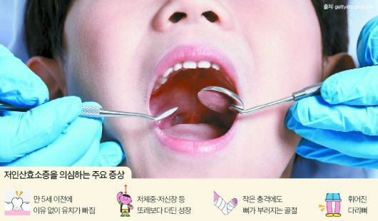 현재 한국에서 저인산효소증은 신생아 선별검사 대상에서 빠져있어 조기 발견이 어렵다. 유치 조기 탈락이라는 구강 증상에 주목하는 배경이다. 특별한 외상 없이 유치가 흔들리다가 뿌리째 빠지는 유치 조기 탈락은 만 5세 이하 저인산효소증 환자의 91.5%에서 나타날 정도로 특징적이다. 일본에서는 영유아 구강검진을 통해 저인산효소증 환아를 100명 이상 조기에 발굴한 사례도 있다. 유치 조기 탈락이 아동기 저인산효소증을 의심하는 핵심 단서가 될 수 있다는 의미다. 연세대 치과대학병원 소아치과 강정민 교수는 “유치가 빨리 빠진다고 무조건 희귀질환인 것은 아니지만, 또래보다 유치가 빨리 빠졌다면 치과에서 문제가 있는 상황인지 살펴보는 것이 좋다”고 말했다. 저인산효소증이라면 단순히 유치만의 문제가 아니다. 구강 영역에서 치아 표면인 법랑질이 쉽게 거칠어져 충치가 잘 생긴다. 평생 써야 할 영구치도 약해져 틀니를 착용해야 하는 상황이 발생할 수 있다.