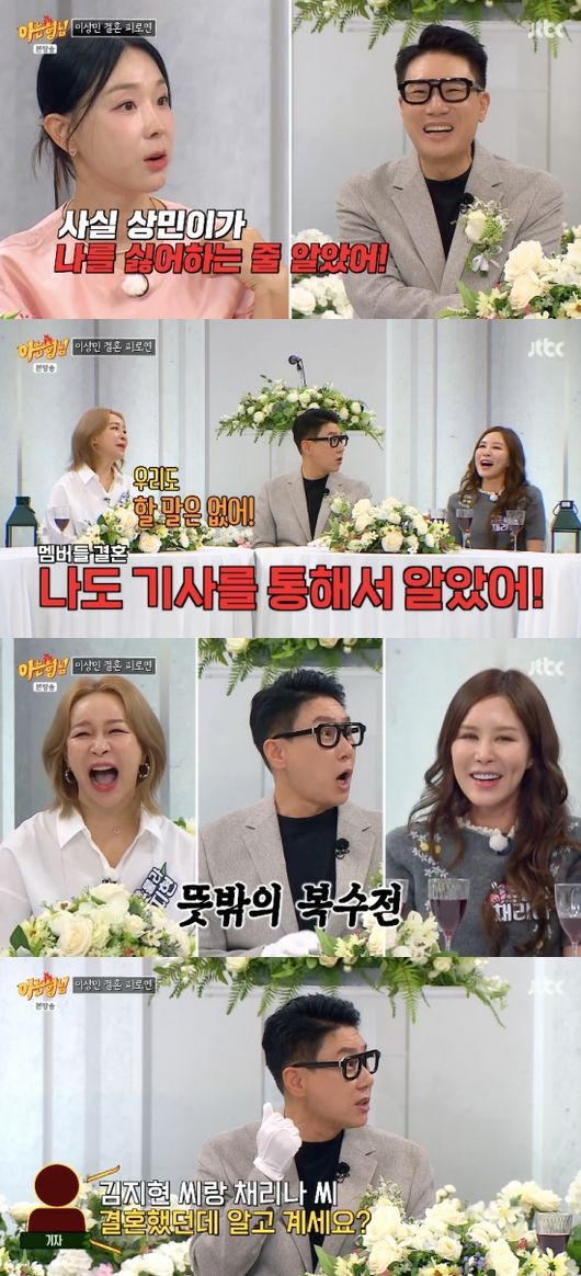 7일 방송된 JTBC 예능 ‘아는 형님’(이하 아형)은 이상민의 결혼을 기념한 특별한 피로연이 진행, 룰라의 김지현, 채리나, 디바 김진, 샵 출신 이지혜 등 이상민의 오랜 동료들이 총출동해 축하의 뜻을 전했다.